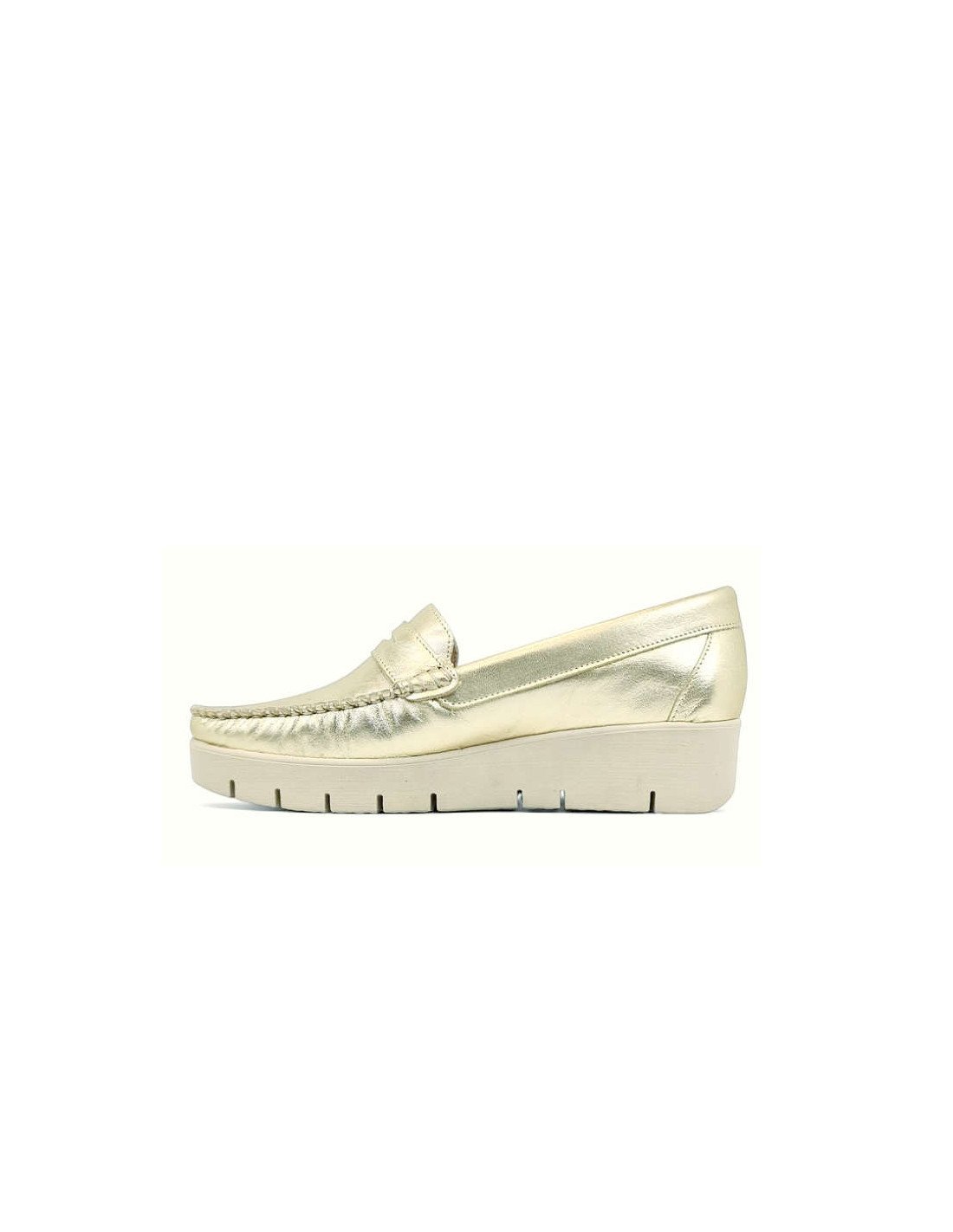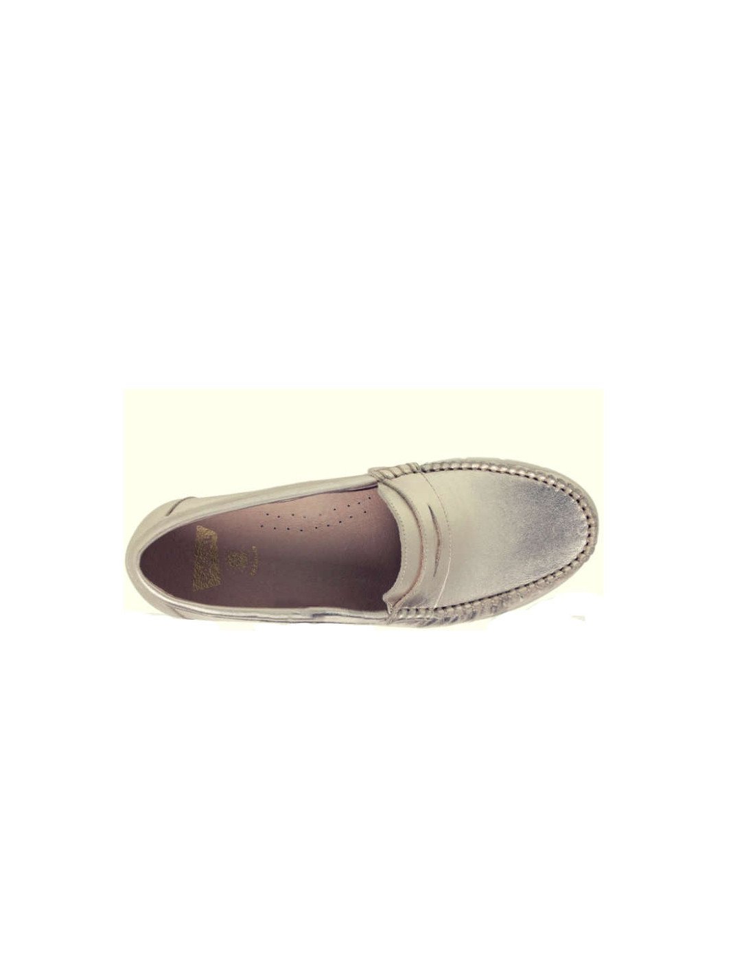 Éste mocasín de mujer en piel metalizada lleva una cuña de goma bastante cómoda de 4 cm de altura, que se amolda perfectamente al pie para darle el mayor confort.