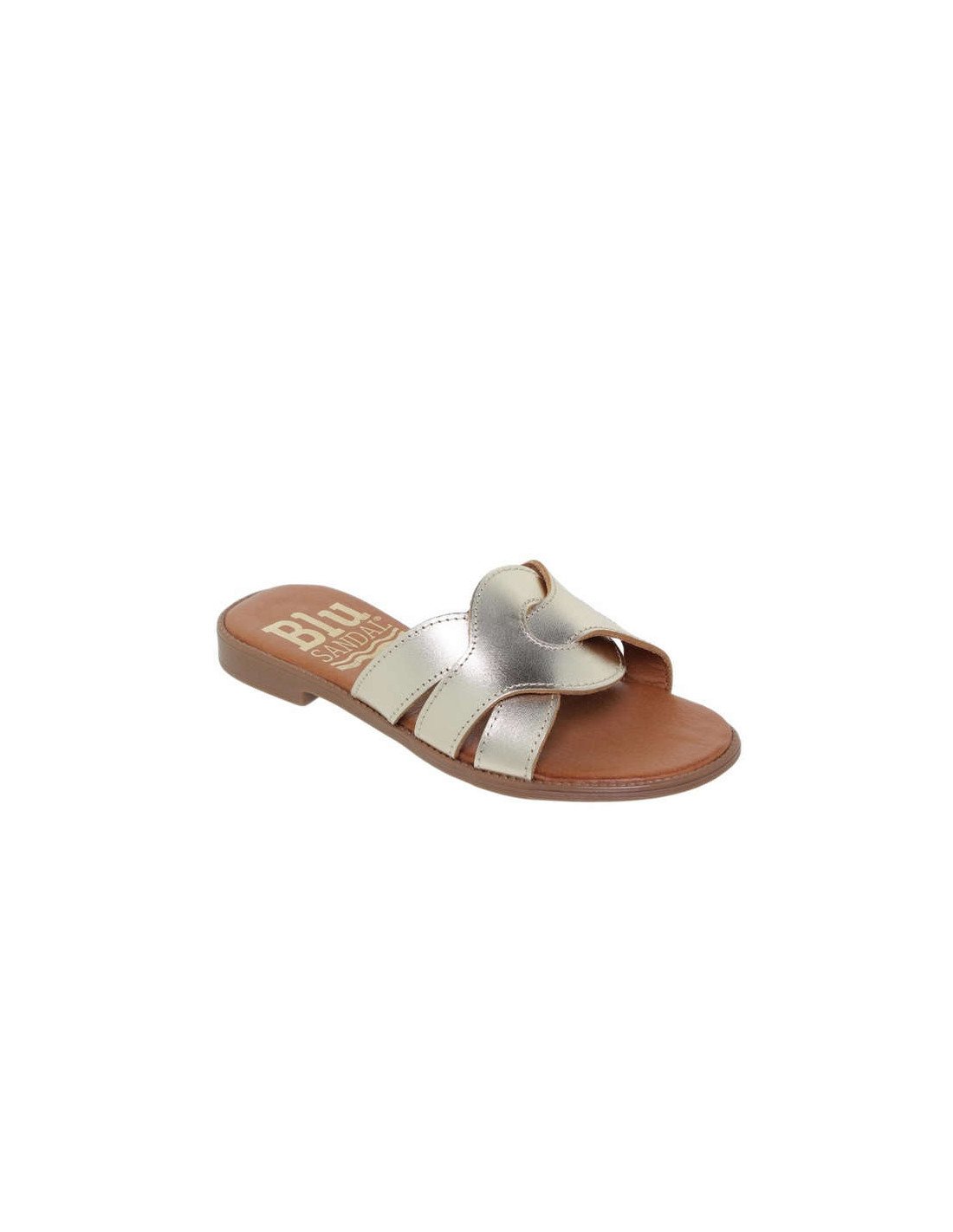 Sandalias mujer planas cómodas piel oro, unas sandalias tupo zuecos, con plantilla de gel y piel suavidad en cada pisada, adorno en la pala muy original, marca Blusandal, hechas en Elche, España.