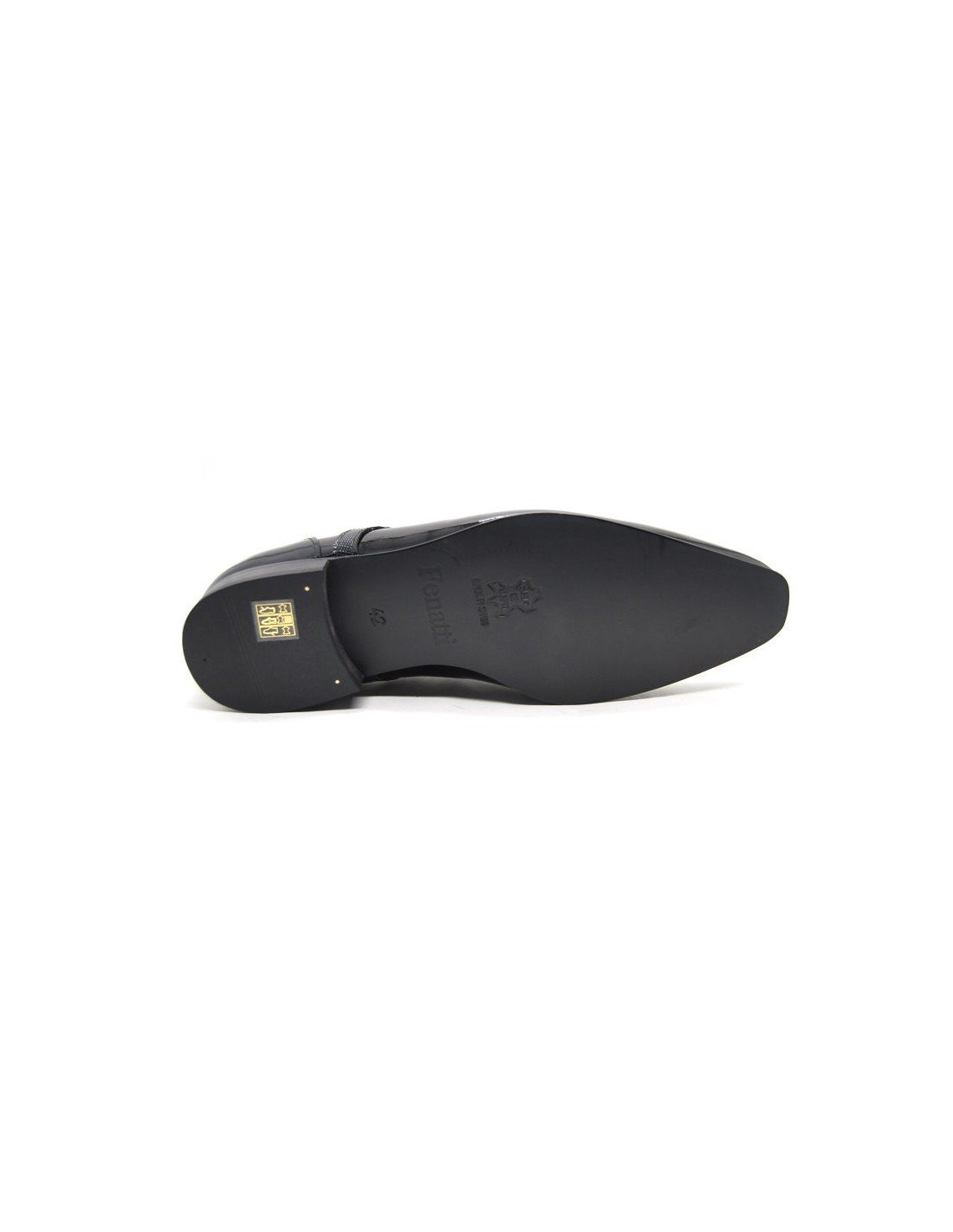 Zapato hombre ceremonia marino, en piel charol, forro interior de piel y plantilla de piel, con suela de cuero tintada en negro, hecha y cosida a mano en Almansa.